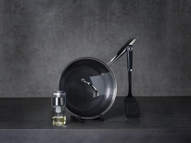 What really sets our products apart from your regular pots and pans, is the unique laser etching process that creates the patented ONYX COOKWARE™ hexagon design. This unique process creates a series of peaks and valleys on the pots and pans. In the valley is the non-stick material, making sure you get that non-stick functionality and easy cleanup. One of the peaks you get is the stainless steel, providing durability, perfect sear on your meat and the ability to use metal utensils and tools. This is why we call our pots and pans “hybrid”. They provide you with the best of two worlds; The non-stick functionality that we all want in our pots and pans and the durability of a professional stainless steel or cast iron pan.