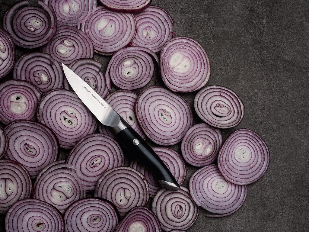 With our ONYX COOKWARE™ Paring knife, achieving a perfect edge is a breeze, requiring minimal effort. The stainless-steel blade, renowned for its enduring sharpness, responds superbly to standard sharpening techniques. This means you can easily maintain its razor-sharp edge, ensuring that every cut is precise, smooth, and effortless.