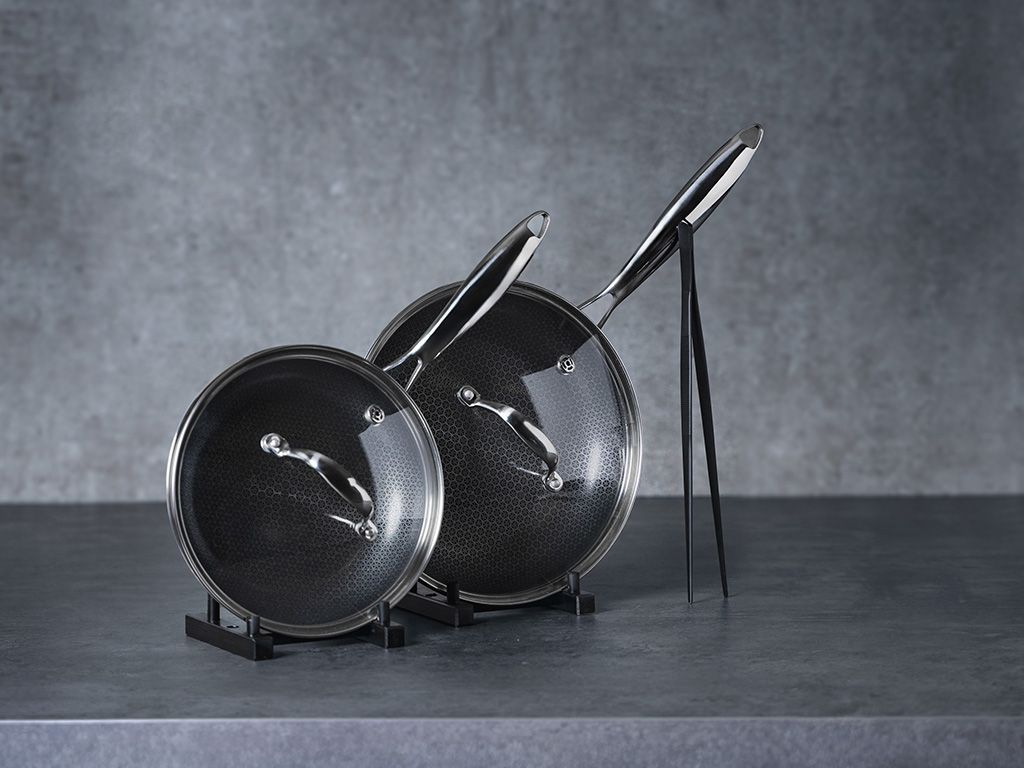 What really sets our products apart from your regular pots and pans, is the unique laser etching process that creates the patented ONYX COOKWARE™ hexagon design. This unique process creates a series of peaks and valleys on the pots and pans. In the valley is the non-stick material, making sure you get that non-stick functionality and easy cleanup. One of the peaks you get is the stainless steel, providing durability, perfect sear on your meat and the ability to use metal utensils and tools. This is why we call our pots and pans “hybrid”. They provide you with the best of two worlds; The non-stick functionality that we all want in our pots and pans and the durability of a professional stainless steel or cast iron pan.